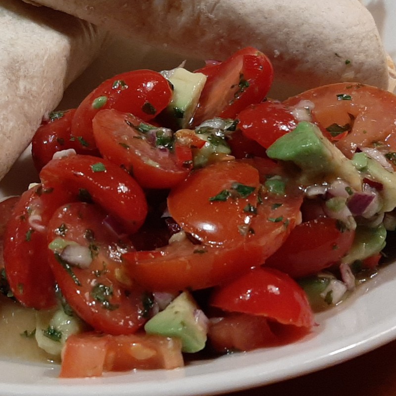 Ingrediënten: avocado, honing, limoen, platte peterselie, Spaanse peper, rode en gele cherrytomaatjes, Roma tomaat, rode ui, zeezout.