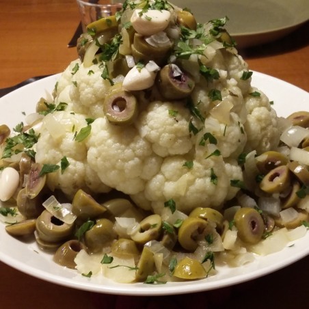 Ingrediënten: bloemkool, olijfolie, groene olijven, peterselie, ui, zout.