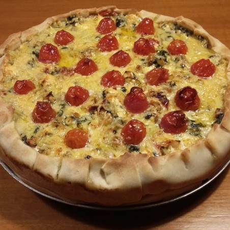 Een smakelijke mix van verse spinazie, feta, pijnboompitten, zongedroogde tomaat, ui en knoflook in een knapperige korst met daarop een laagje gesmolten kaas en cherrytomaatjes.