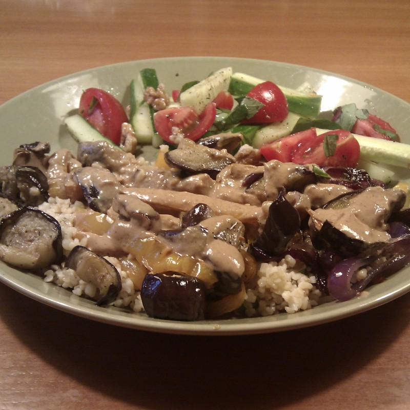 Ingrediënten: aubergine, olijfolie, gele paprika, rode ui, bulgur, koriander, tahin, citroensap, knoflook, sojasaus, zout en peper.