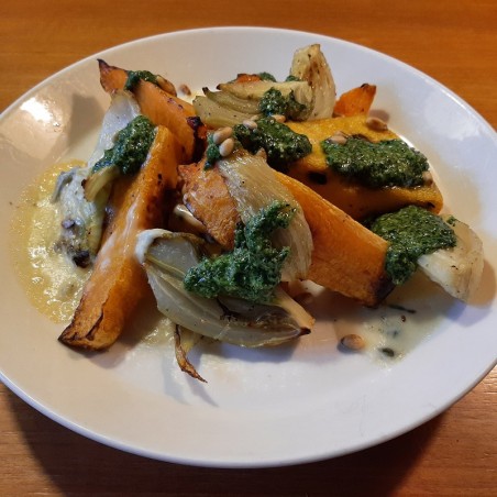 Ingrediënten: witte wijnazijn, basilicum, groentebouillon, gorgonzola, kappertjes, knoflook, Dijonmosterd, munt, olijfolie, zwarte olijven, peterselie, pijnboompitten, polenta, flespompoen, venkelknol, zout en peper.